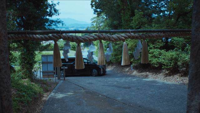 신성한 한자가 적힌 밧줄이 있는 전통 일본 신사