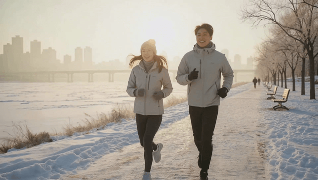서리 낀 강변 길을 웃으며 달리는 커플