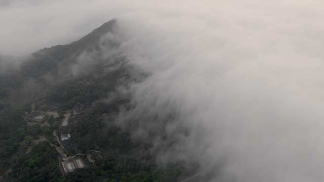 안개 낀 산간 마을의 항공 촬영
