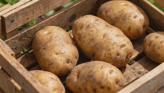 나무 상자에 담긴 신선한 감자