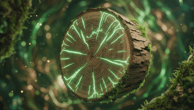 숲 속 낙엽 사이에 잘려 있는 죽순의 단면