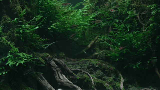 물속 수생식물 사이를 헤엄치는 물고기들의 모습