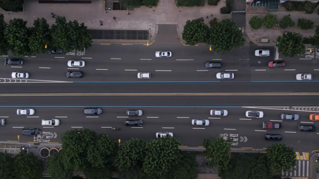 번잡한 도심 도로 교차로의 상공에서 본 전경