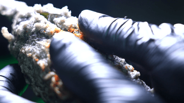 장갑으로 잡은 검은 고추튀김
