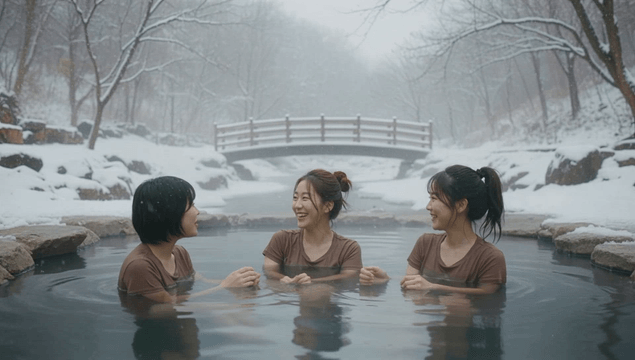 겨울 온천을 즐기는 친구들