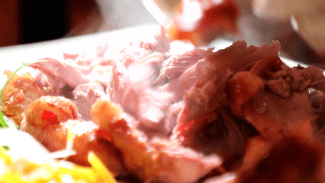 플레이팅된 오리고기에 소스를 붓는 장면