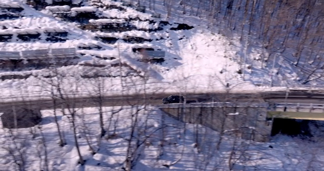 눈 덮인 산길을 운전하는 모습