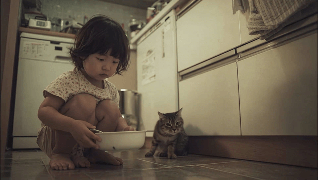 침대 위에서 고양이를 쓰다듬는 아이