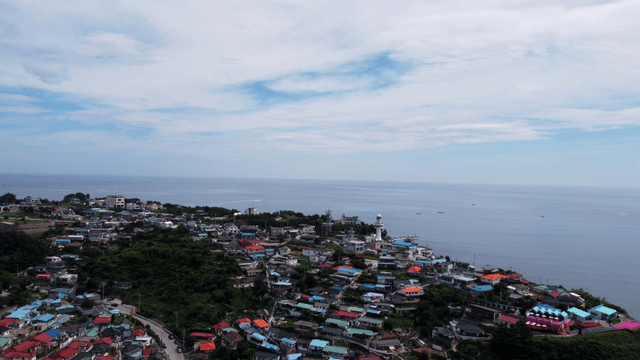 등대와 맑은 바다가 있는 해안 마을