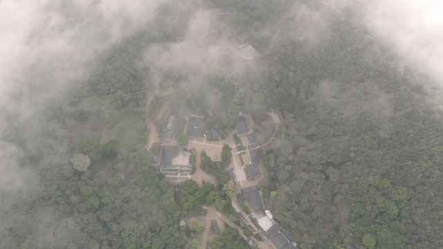 짙은 숲으로 둘러싸인 안개 낀 마을