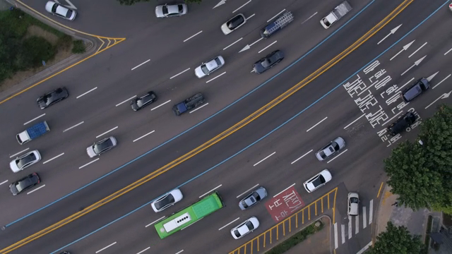 번잡한 도심 도로 교차로의 상공에서 본 전경