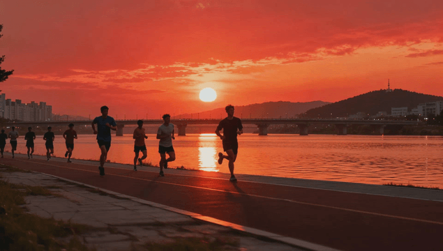 해질녘 이어폰을 끼고 강변을 달리는 여성