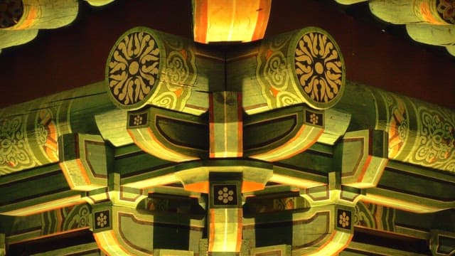 밤에 조명이 켜진 화려한 무늬와 색의 단청