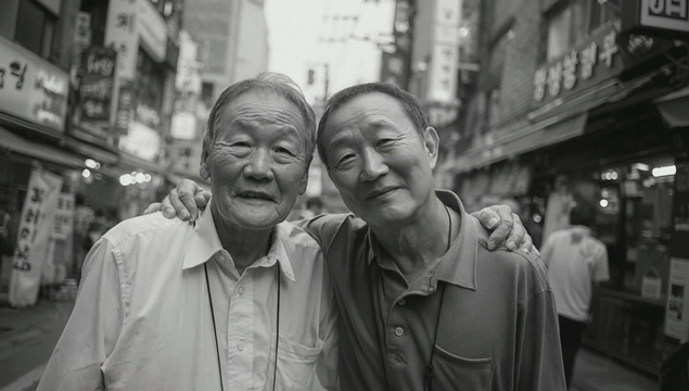 거리에서 함께 웃고 있는 두 노인