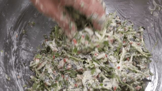 그릇에 강된장과 신선한 옆무잎을 섞는 장면