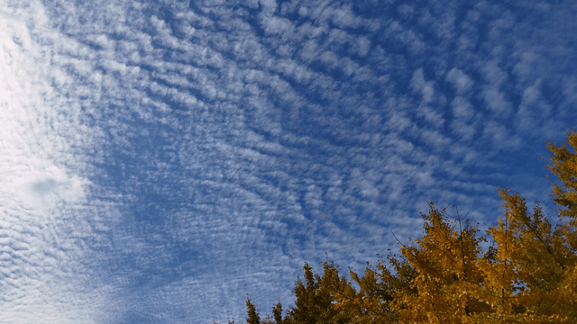 흩어진 구름과 가을 나무가 있는 푸른 하늘
