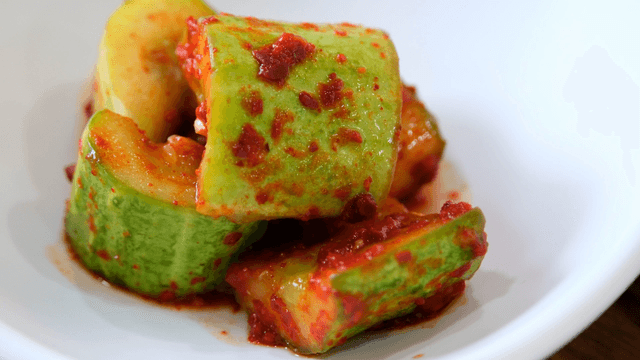 빨간 장갑을 끼고 오이 김치를 만드는 모습