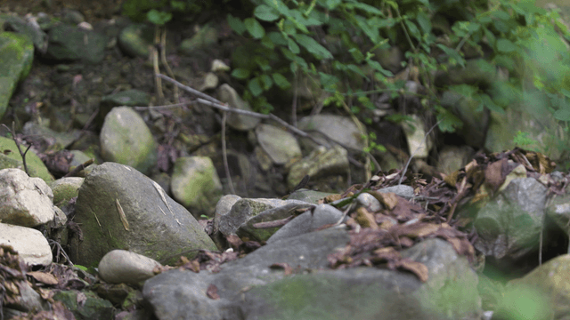 바위와 나뭇잎이 있는 숲 바닥