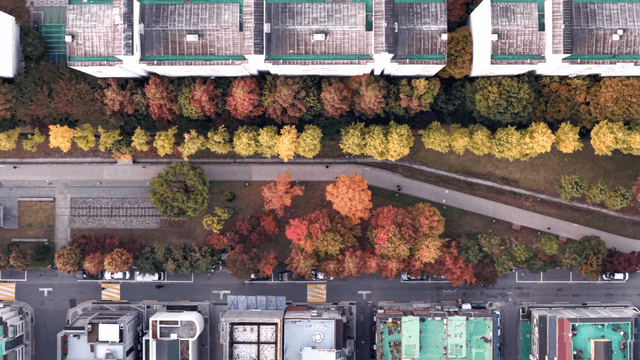 도시 배경과 가을 색채가 어우러진 평화로운 공원