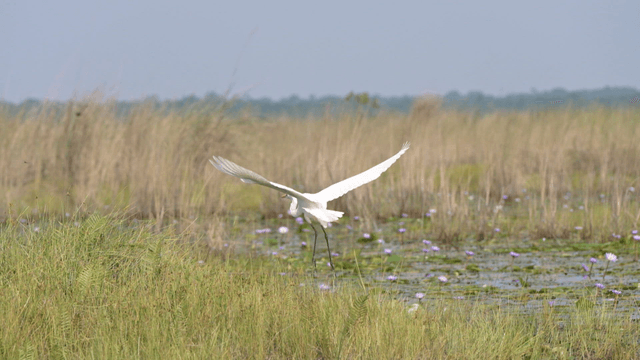 푸른 수풀 사이 습지 위를 가볍게 날아가는 새