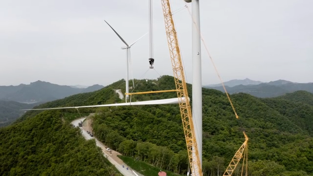 산 속에서의 크레인을 사용한 풍력 터빈 건설 현장