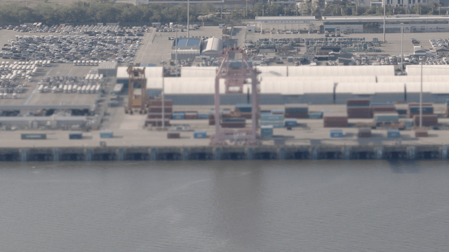 분주한 항구에서 컨테이너를 적재하는 장면