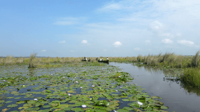 산이 멀리 보이는 구름 낀 하늘 아래 강 풍경