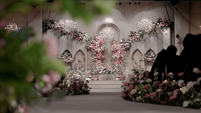 아름답게 꽃이 가득하게 장식된 실내 결혼식장