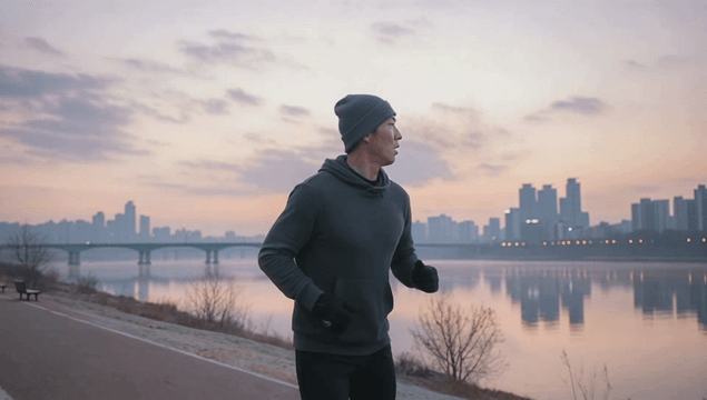 헬스장에서 러닝머신을 웃으며 뛰는 중년 남성