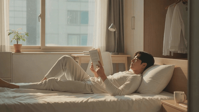 밝은 거실 창가에서 책을 읽는 남자