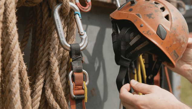 야외에서 암벽 등반을 준비하는 등산가