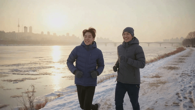 눈 덮인 강변 길을 달리는 커플