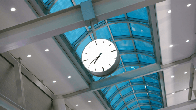 흐린 하늘 아래 높이 솟은 시계탑의 상부구조