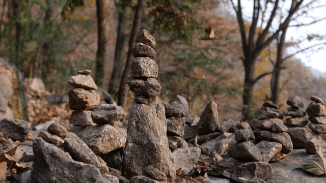 노란 잎과 쌓인 돌탑이 있는 가을 숲