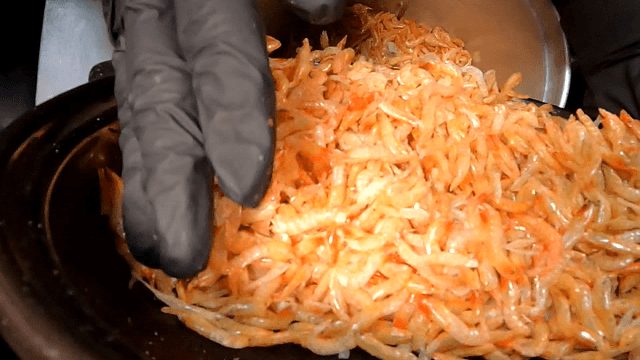 식재료들이 들어있는 금속 대야에 추가되는 새우젓