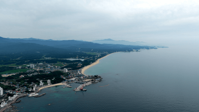 산 아래 펼쳐진 해안 마을과 잔잔한 바닷가