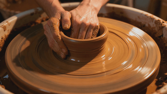 도자기 물레에서 점토를 빚는 수업