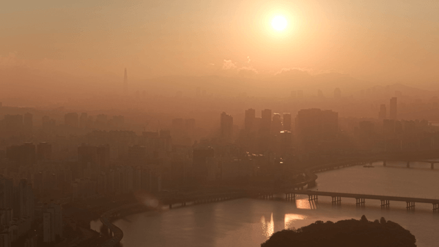 도시 전경 위로 지는 해