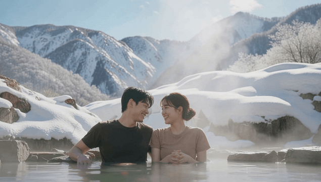 눈 덮인 산을 배경으로 온천에서 휴식을 취하는 커플