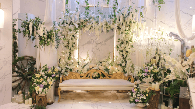 흰 꽃과 소파로 가득한 신부 대기실
