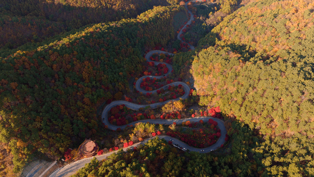 알록달록한 가을 숲을 지나는 구불구불한 도로