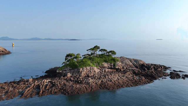 작은 섬과 흐린 하늘이 있는 잔잔한 바다