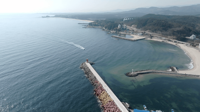 멀리 산이 보이는 고요한 해안 풍경