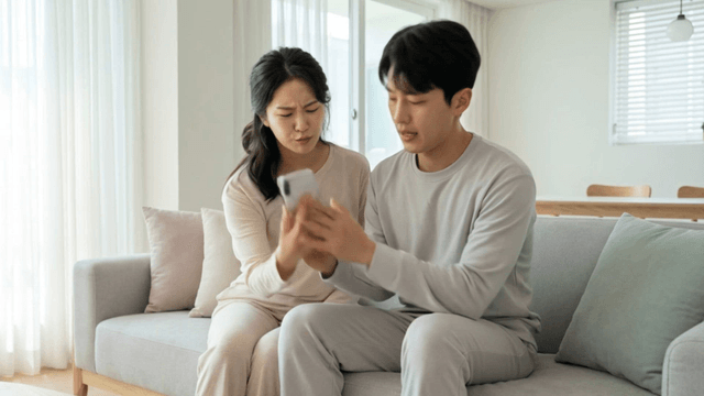 거실 소파에서 함께 스마트폰을 보며 시간을 보내는 커플