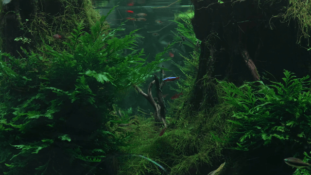 무성한 수족관에서 헤엄치는 작은 물고기
