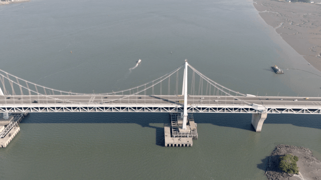 숲이 우거진 언덕 위로 강을 가로지르는 다리