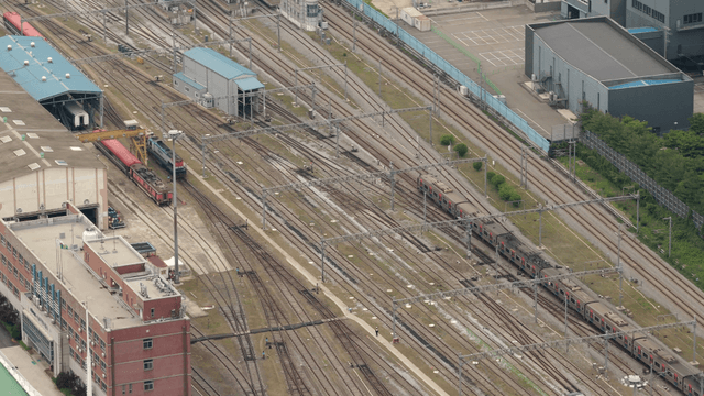 달리는 열차에서 바라본 철도와 플랫폼 풍경