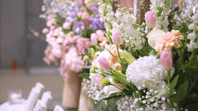 실내에서 두 개의 꽃다발을 들고 있는 사람