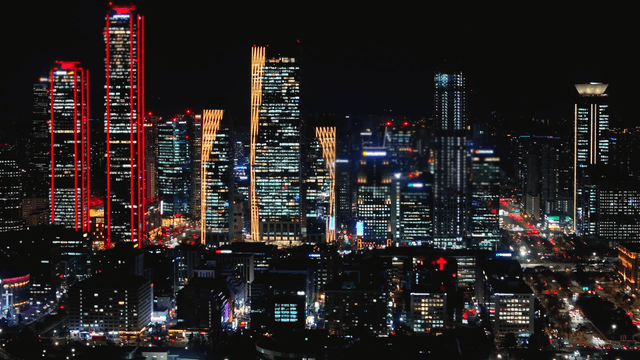 높은 빌딩과 밝은 불빛이 어우러진 번화한 도시의 야경