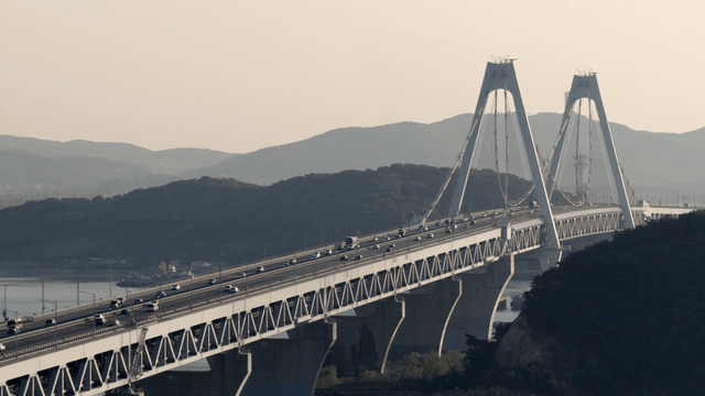 강 위 일자로 뻗은 다리를 달리는 자동차들